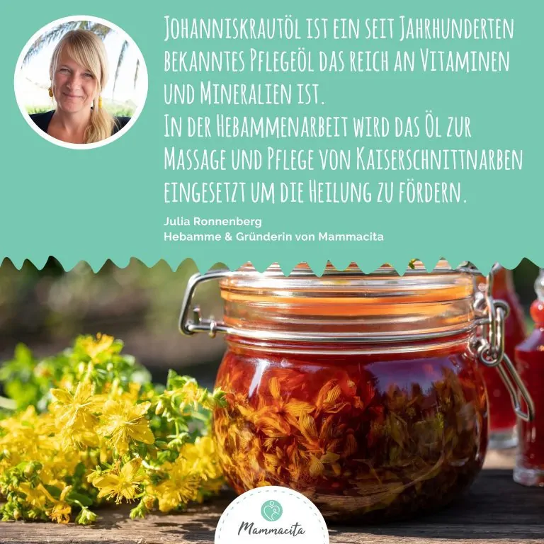 - Regenerierende und beruhigende Eigenschaften des Johanniskrauts unterstützen die Heilung von Hautirritationen und Narben, auch nach einem Kaiserschnitt